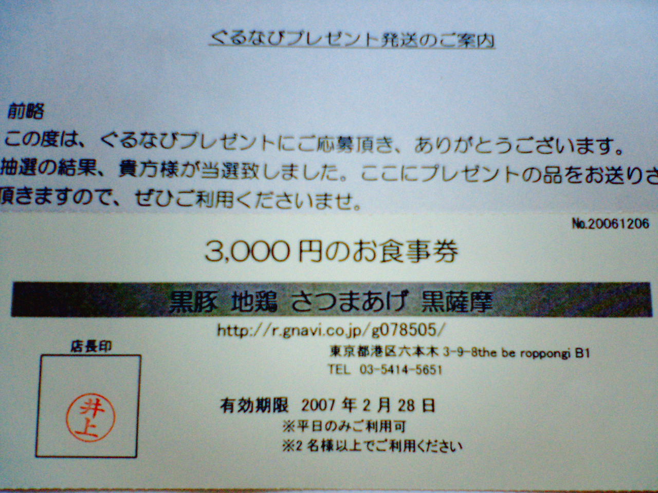 「ぐるなび」 のお食事券が当たりましたー。 何回目だろう、当たるの。うれしい